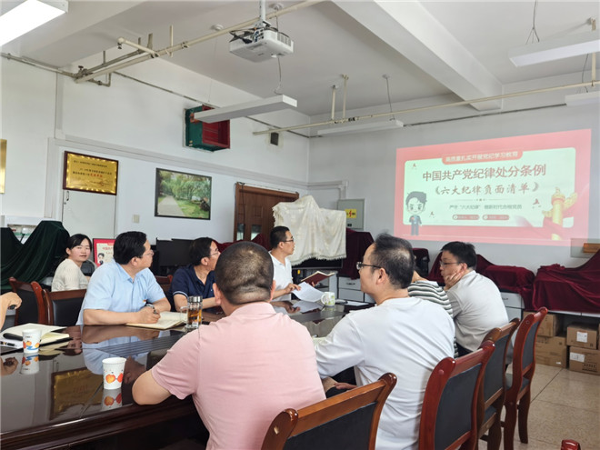 会议学习了习近平总书记在企业和专家座谈会上的重要讲话精神和习近平总书记在《求是》杂志发表的重要文章“全面深化改革开放,为中国式现代化持续注入强劲动力”。 监督审计处党支部书记段立斌组织学习了《中国共产党纪律处分条例》和“六大纪律”负面清单,通报了院内外违规违纪案例和研究所审计发现问题。