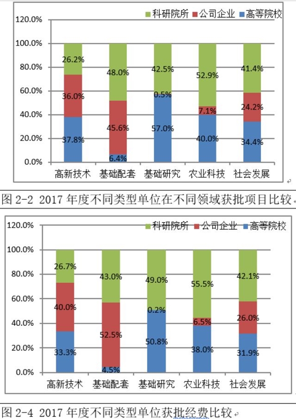 值得关注的是,上述1078个项目由557家法人单位牵头承担,包括112所高等院校、225家科研院所和220家公司企业。其中高校承担了395个项目,同比降低1.8%。与去年相比,虽然在承担项目上有所减少,但是在获批经费上同比增加4.8%,达76.7亿元。以变化较大的农业科技领域为例,农业科技在高校的经费和项目投放上则增加了约15%。