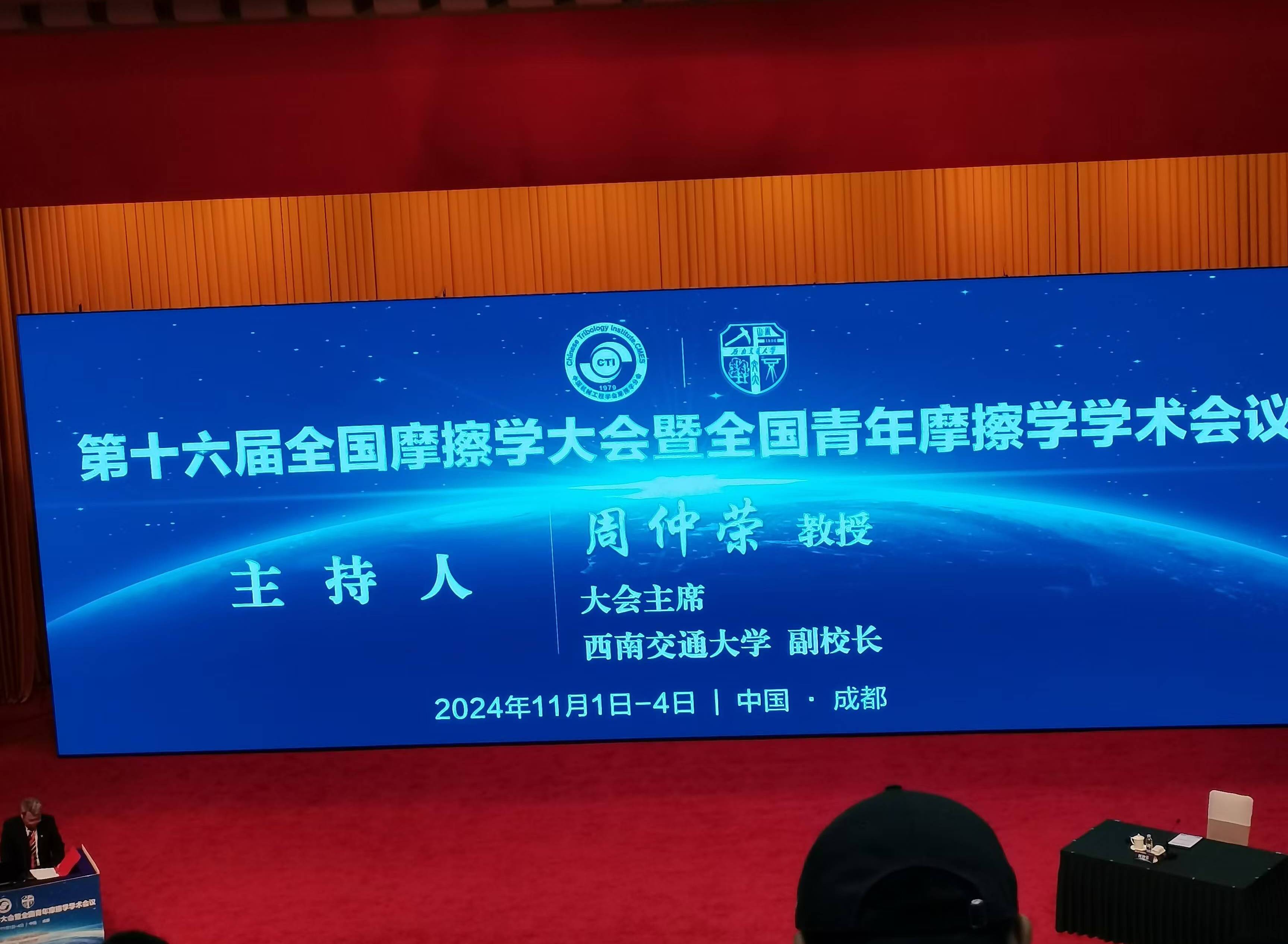 2024年11月1日至4日,备受瞩目的第十六届全国摩擦学大会暨全国青年摩擦学学术会议在四川成都盛大召开。此次盛会吸引了众多摩擦学领域的专家学者、科研人员及学生,共同探讨摩擦学的最新研究成果和未来发展趋势。213计算摩擦学课题组的全体职工和学生也积极参加了此次盛会,展示了他们在摩擦学领域的最新研究成果。此次会议由西南交通大学副校长、大会主席周仲荣教授主持,并邀请了中国工程院院士薛群基、四川省政协副主席杨丹教授、西南交通大学副校长闫学东教授等嘉宾做了嘉宾致辞。