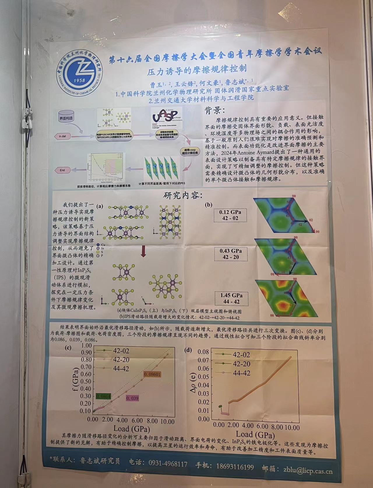 213计算摩擦学课题组的成员们积极参与了各项议程,包括主题演讲、分组讨论和成果展示等环节。课题组组长鲁志斌研究员做了题目为摩擦的第一性原理模型研究报告,展示了在摩擦学计算、材料磨损机制、润滑技术等方面的最新研究成果,获得了与会专家和同行的高度评价。