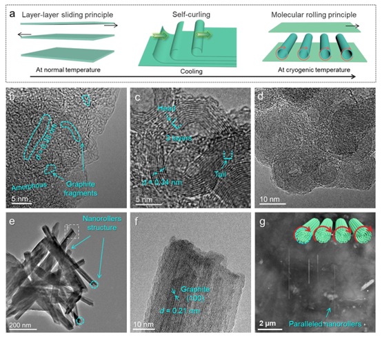 图1低温下石墨的分子滚动润滑示意图。(a)层间滑动和分子滚动润滑示意图及结构演变。(b) 300 k时摩擦界面的微观结构。(c, d) 50 k时形成的纳米卷的放大图形成的石墨纳米辊轴向图。(e和f) 摩擦界面微观结构的TEM图像。(g) 50 K时摩擦界面的SEM形貌。