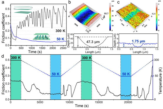 图2石墨在300k和50k真空条件下的摩擦磨损行为。(a)真空下,300 K和50 K时石墨的摩擦系数曲线。(b) 300 K时摩擦后的三维(3D)轮廓和磨损痕深度。(c) 50 K时摩擦后的三维轮廓和磨损痕深度。(d)真空中,300 K和50 K交变温度下石墨的摩擦系数曲线。