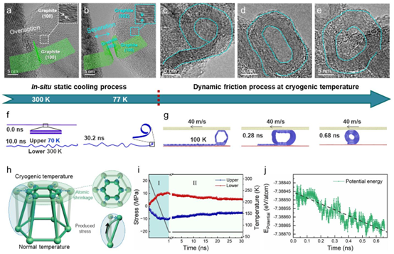 图3石墨纳米辊形成及机理的MD模拟与实验。(a,b)在300K—77K范围内的原位HRTEM图像观测和GNSs示意图。(c-e) HRTEM图像显示了石墨纳米辊在实验摩擦过程中的结构演变。(f) 300-70K温度梯度下石墨烯纳米片边缘自卷曲的分子动力学模拟。(g)在100k的摩擦过程中,完整石墨纳米辊形成的MD模拟。(h)原子变形晶格畸变引起应力的示意图。(i) GNSs上层和下层应力沿x方向随时间的变化(Ⅰ阶段对应上层原子温度从300 K降至70 K,Ⅱ阶段温度保持恒定)。(j)纳米辊形成后石墨烯/纳米辊/石墨烯体系势能曲线。