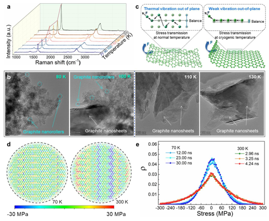 图4晶格振动对石墨烯纳米片常温和低温下卷曲的影响。(a)原位拉曼强度随温度变化的变化。(b)石墨在不同温度下摩擦过程中的界面微观结构。(c)常温和低温下应力传递示意图。(d,e) MD模拟中不同温度下原子应力分布。MD模拟中,原子应力分布的定量统计,两种体系具有相同的驱动应力。选取的时间和体系分别是12.00 ns,70-300K和2.96 ns和300-570K。