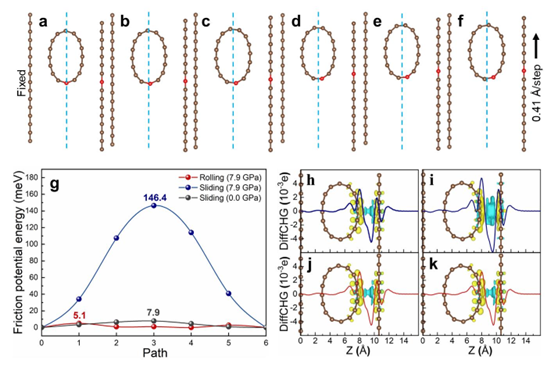 图5摩擦过程中石墨纳米辊分子滚动润滑机理的DFT模拟。(a-f)滚动过程(为了简化模型,单个碳纳米管替代石墨纳米辊),两层石墨烯之间的距离为10.45 Å,相应的载荷为7.9GPa。为了显示滚动过程,两个C原子被涂成红色,标记了石墨烯层的中心线。(g)滑动和滚动过程中的摩擦势能。(h-k)差分电荷密度及其面内积分。