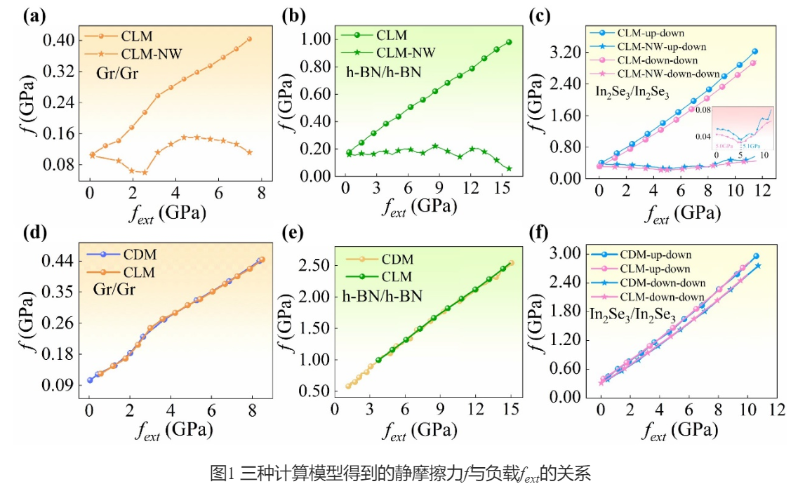 近日,中国科学院兰州化学物理研究所润滑材料全国重点实验室计算摩擦学课题组与兰州交通大学材料科学与工程学院等单位合作,使用自主搭建的固体界面摩擦性能第一性原理高通量计算平台LICP-FPHTC-Platform ( 摩擦学学报42(2022)493;软件著作权2021SR1172689),考虑目前主流的三种静态摩擦性能计算模型——等距模型(CDM)、等载模型(CLM)、无负载做功的等载模型(CLM-NW),针对已报道了负摩擦系数的二维材料界面体系——Gr/Gr、h-BN/h-BN、In2Se3/In2Se3,研究了摩擦性能的计算结果对计算模型的依赖。结果表明,只有CLM-NW的计算模型出现了文献报道的负摩擦系数现象,CDM和CLM的摩擦计算结果定量一致(图1)。