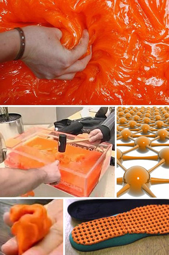 d3O凝胶 一种名为“d3O”的可吸收能量的创新性凝胶状物质,已应用到衣服、鞋子和军事装备的制造中。据悉,d3O凝胶采用尖端纳米技术研制而成,表面看上去非常像果冻,它可以被随意挤压成各种形状。正常情况下,d3O凝胶会保持松弛的状态,一旦受到外力的高速剧烈撞击时,分子将互相交错并锁在一起,变紧变硬,能将子弹或弹片的冲力减弱一半,进而阻止它们穿透头盔。美国滑雪队使用了含有d3o凝胶材料的运动装备,由于滑雪队员的冲刺速度往往达到每小时60英里,这种凝胶材料无疑可以为他们提供足够的保护。