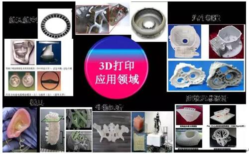 相对于传统制造技术,使用3D打印技术制造三维产品具有节省材料,成型精度较高,无需复杂制件、传统的刀具、夹具、机床或任何模具等优点。此外,3D打印无需集中的、固定的制造车间,具有分布式生产的特点,且能在数小时内成形组装好产品。因此,3D打印技术已经在工业造型、机械制造、航天航空、军事、建筑、医学、文化艺术及考古等领域得到了广泛的应用,图4展示了目前3D打印技术的应用领域及制件,随着技术的发展和革新,其应用领域将不断拓展。