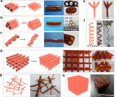 利用SCIRP技术,研究人员还成功制得了复杂结构三维水凝胶管材料。他们发现,当以铁丝或棒状含铁复合材料作为生长模板时,移除模板后可获得中空水凝胶管。于是,他们拓展了凝胶管的化学组分,成功制备得到了8至9种不同化学组分的水凝胶管材料。通过使用多根铁丝作为生长模板,可制备得到具有复杂结构的三维水凝胶管材料(图3)。