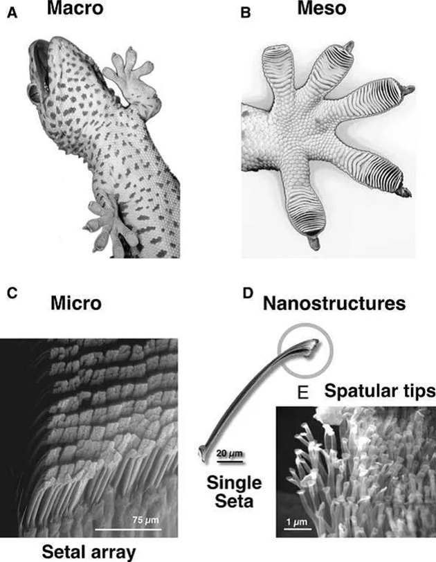 壁虎快速、可逆、可调控的黏附力来源于其特殊的脚趾。事实上,我们用肉眼就能观察到壁虎柔软的脚趾上呈现出毫米级的条带状褶皱。通过光学显微镜的放大,我们能够观察到其条带状的褶皱是由许多密集的微米尺度的纤维组成的。而利用扫描电子显微镜技术,存在于壁虎脚趾上的复杂微观黏附结构系统才得以揭示:壁虎脚趾的黏附系统是一种跨尺度的多级分形纤维状结构。其由数以百万计的被称为刚毛(setae)的细小毛发状结构组成,这些结构在尖端进一步分裂为200纳米宽和5纳米厚的纳米结构突触(spatulae)。这种特殊的多级分形的结构能够克服表面粗糙度的影响,与黏附基底表面形成良好的接触,从而产生超过壁虎体重多倍的黏附力。
