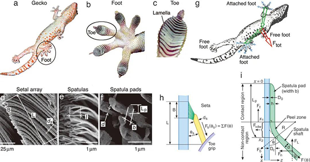 图3 脚趾的机械形变在壁虎可逆黏附中的作用。(a-f)宏观-微观的壁虎与壁虎脚趾形貌。(h,i)壁虎脚趾剥离模型。