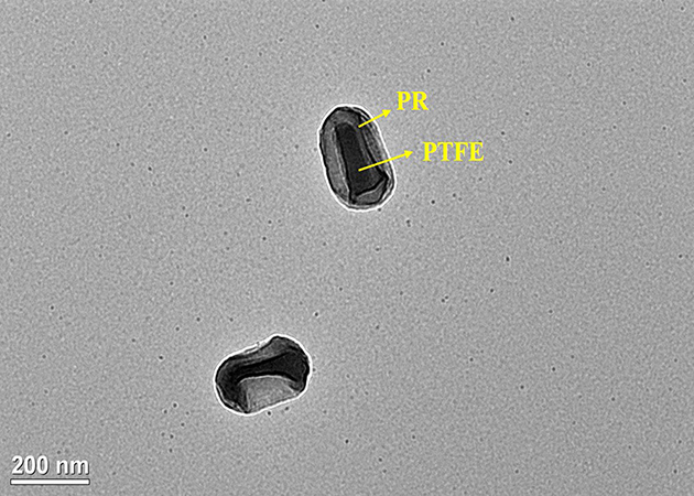 (酚醛树脂包覆聚四氟乙烯的核壳纳米粒子在透射电镜下的形貌图,再进行PS着色处理。)