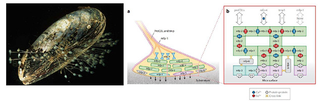 图1. 贻贝的黏附。(左)贻贝(a)贻贝足丝图,(b)贻贝不同种类足丝蛋白分布图