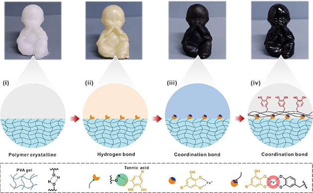 最近,中国科学院兰州化学物理研究所周峰研究员团队利用空间位阻效应,阻碍锚固层金属离子(Fe3+)和单宁酸的渗透,基于此将含邻苯二酚的胶黏剂P(MEA-co-DMA)(聚多巴胺甲基丙烯酰胺-甲氧基乙基丙烯酸酯)牢牢地锚定在PVA(聚乙烯醇)水凝胶表面,最终实现了一种能够水下黏附的水凝胶“便利贴”。