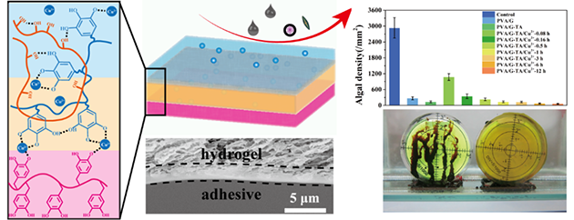 更重要的是,这种方法可以实现凝胶的单面修饰,所得到的水凝胶“便利贴”两面具有完全不同的性质,一面“水水嫩嫩”的同时,另一面还能牢靠地贴在不同基底的表面。如果我们将用来锚固金属离子(Fe3+)替换为Cu2+时,该材料还可以表现出透明、防油污损、防生物污损的性能,在水下仪表、潜艇观望镜、潜水镜等方面具有一定的应用潜力。