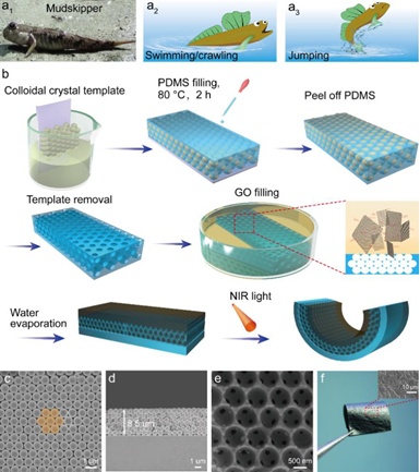弹涂鱼具有陆地爬行、水中游泳、泥中跳跃的独特特征,是一种具有多场景适应能力和多功能驱动行为的鱼类。受弹涂鱼启发,中国科学院兰州化学物理研究所固体润滑国家重点实验室表面与界面研究团队开发了一种能对各种环境做出响应的智能光驱动器。