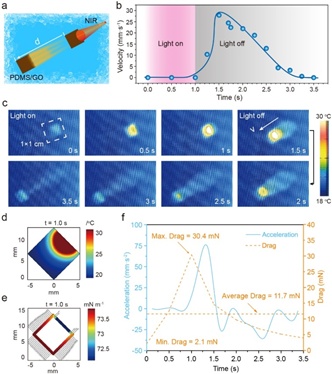研究人员研制的驱动薄膜中具有光热效应极好的氧化石墨烯(GO)材料,可将光能转换成热能,当光照射漂浮于水面上的驱动薄膜时,薄膜会产生一定的温度并传递给周围的液体,造成局部水温升高进而影响水的表面张力。