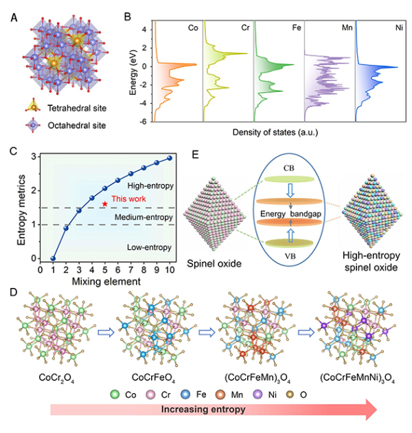 基于前期高熵尖晶石氧化物红外辐射性能的研究基础,近日,研究人员开展了高熵尖晶石氧化物光吸收机制研究。为实现太阳光全波段光吸收特性,研究人员通过选用电子分布互补的过渡金属元素对材料的能带结构进行理论设计,采用溶胶-凝胶燃烧法成功制备出一种具有面心立方结构(FCC)单相结构的高熵尖晶石氧化物。与二元尖晶石氧化物相比,高熵氧化物由于独特的高熵效应、晶格畸变效应和鸡尾酒效应,使得轨道能级发生分裂、费米能级附近电子密度增加以及金属与氧强杂化作用,将尖晶石氧化物的带隙从2.65 eV大幅度降至0 eV,实现了准金属特性,促进了电子从价带向导带跃迁,从而实现全波段太阳光吸收特性。