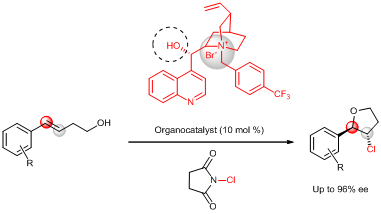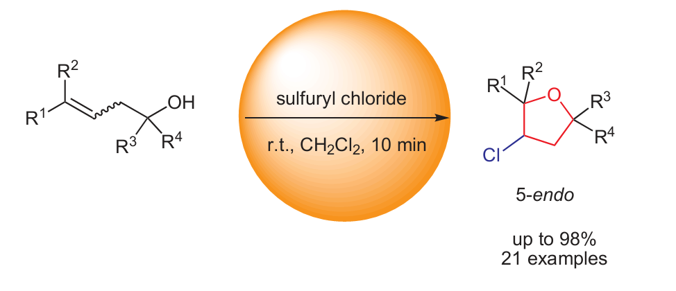 2. Xianghua Zeng, Chengxia Miao, Shoufeng Wang, Chungu Xia, Wei Sun *, Application of Sulfuryl Chloride for the Quick Construction of β-Chlorotetra hydrofuran Derivatives from Homoallylic Alcohols under Mild Conditions, Synthesis, 2013, 2391-2396.