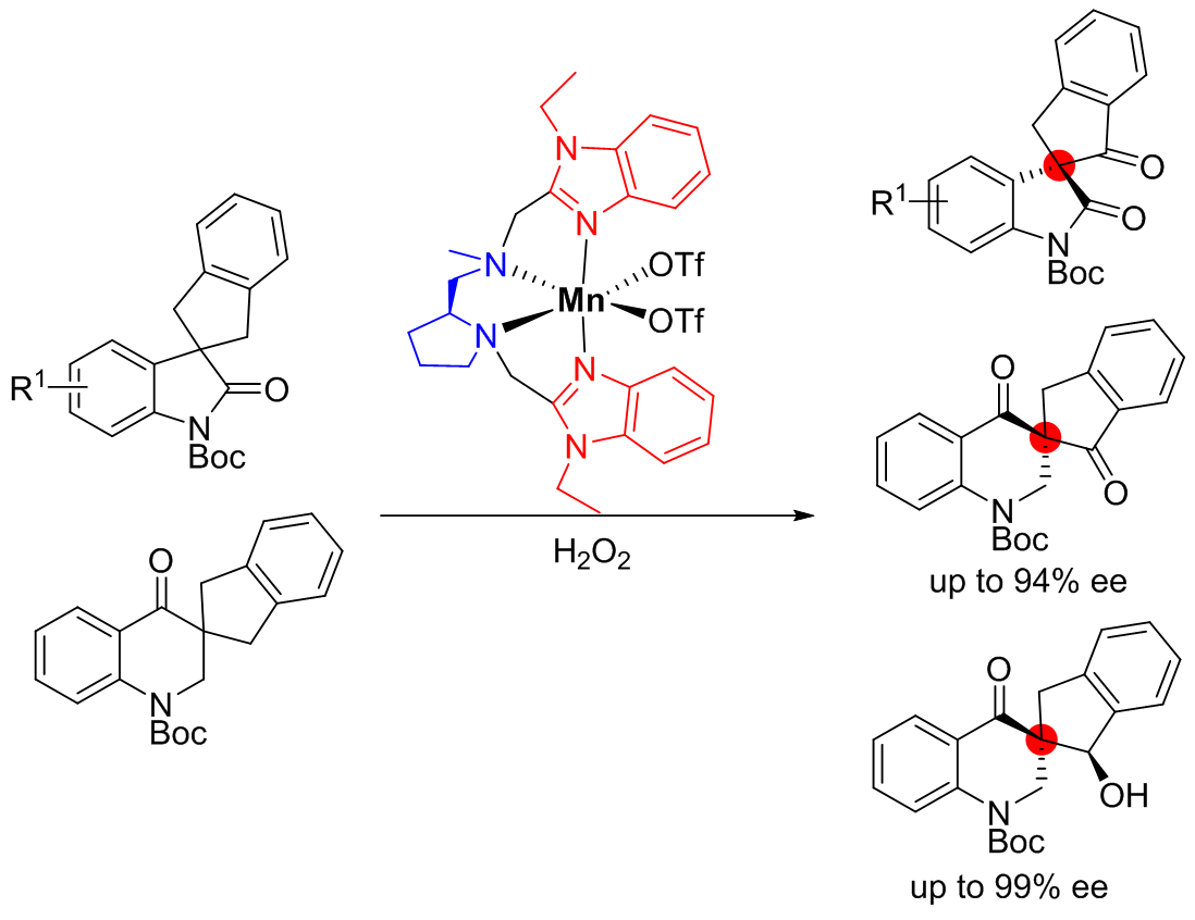 最近我组邱斌博士关于C-H选择性氧化的工作Manganese-Catalyzed Asymmetric Oxidation of Methylene C-H of Spirocyclic Oxindoles and Dihydroquinolinones with Hydrogen Peroxide在Org. Lett.发表。