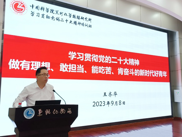 兰州化物所党委书记王齐华作了题为“学习贯彻党的二十大精神 做有理想敢担当能吃苦肯奋斗的新时代好青年”的专题党课,并对全体研究生同学提出希望和要求。希望同学们以习近平新时代中国特色社会主义思想为指导,认真学习领会党的二十大精神、习近平总书记关于科技创新的重要论述和指示批示精神。面向世界科技前沿、面向国家重大需求、面向国民经济主战场、面向人民生命健康,刻苦钻研,勇于创新,大力传承弘扬科学家精神,培养高尚的品格、积淀丰厚的学养、保持良好的心理状态,努力成长为对国家、对民族有用的创新人才,把个人的理想追求融入党和国家事业之中,为早日实现高水平科技自立自强贡献青春力量和智慧。