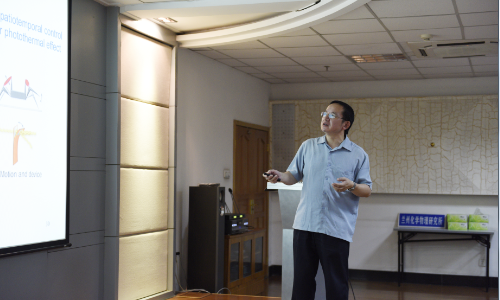 赵越教授及其研究团队主要致力于刺激响应性高分子和复合材料的研究。报告中,赵越教授首先介绍了刺激响应性材料的基本定义和前沿研究进展以及刺激响应性材料在传感、智能材料等领域的重要作用和意义。随后,他详细介绍了其团队通过在聚合物分子链中加入响应性单体实现聚合物对光、温度、pH、CO2和超声等可控、可逆响应性能,以及利用聚合物对光、CO2和超声的可控、可逆响应性能在聚合物凝胶、传感器和形状记忆及自修复材料方面的应用研究。报告结束后,赵教授与参加的老师和学生就该领域相关问题进行了交流讨论。