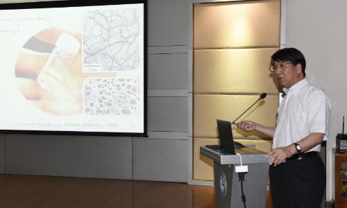 报告中,伊原博隆教授首先介绍了其课题组在超分子凝胶方面取得的最新研究进展,特别介绍了超分子凝胶在荧光材料和波长转换膜的制备和应用方面的亮点工作以及超分子凝胶在新型高选择性液相色谱固定相方面的一些显著优势。随后,伊原博隆教授与大家分享了自己对中日国际合作交流工作的深入开展的一些设想。