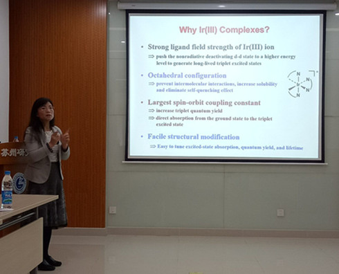 11月18日上午,美国北达科他州立大学(North Dakota State University )化学系Wenfang Sun教授应邀访问中国科学院兰州化学物理研究所苏州研究院,并作了题为“Exploration of Cationic Ir(III) Complexes as Broadband Reverse Saturable Absorbers: Tuning the Ground-state and Triplet Excited-state Absorption and Lifetime via Ligand p-Conjugation”的学术报告。