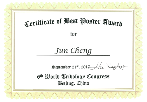 学术报告环节,兰州化物所多人应邀作报告。会议开幕前,中国工程院院士、兰州化物所学术委员会主任委员薛群基研究员作为会议的六名知名专家之一作了题为“润滑材料摩擦化学”的培训主旨报告。大会期间,刘维民院士作了题为“航天技术中的摩擦学”的大会主旨报告,周峰研究员和张俊彦研究员分别作了题为“湿滑:润湿和润滑相互关系”和“工程规模超滑碳膜”的分会场邀请报告,贾均红研究员、王金清研究员、孟军虎研究员、张松伟副研究员、麻拴红助理研究员以及研究生张贝贝、李毅和郭月霞等人分别作了口头报告。周峰研究员、张俊彦研究员、贾均红研究员等主持了部分分会报告。墙报展示环节,程军副研究员、郭丽和、王永福等分别对自己的研究工作进行了展示,其中程军副研究员获得“最佳墙报奖”。