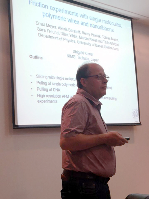 报告中,Ernst Meyer教授综述了与单分子、聚合物导线和纳米片等相关摩擦方面研究进展,通过实例详细介绍了单个卟啉分子在铜(111)表面滑动精确操控实验以及石墨烯纳米带在金表面上的制备过程,通过计算模拟或影像动态展示了相关摩擦过程,阐释了卟啉分子基团、键结构和动力学行为对其摩擦行为的影响规律,以及石墨烯纳米带在金表面上周期性变化的摩擦力与纳米带边界之间的关联性规律,并与参会师生进行了交流。