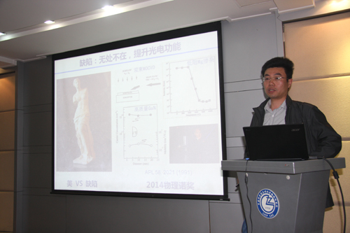 曾海波教授从三个方面系统介绍了其课题组最近关于纳米晶光电功能的缺陷效应研究工作。一是依据维度缺陷设计新型超薄半导体,实验实现了白石墨烯导电性转变、单层硫化钼相杂化电容提升、多层黑磷化学掺杂光探测器;设计了砷烯、锑烯等一系列VA族新型二维半导体,揭示了其高稳定性、可调带隙、高迁移率,及潜在电子、光电子、应力传感应用前景。二是基于缺陷态发展无毒无稀土发光纳米晶,提出了氧化锌蓝色发光的间隙锌缺陷态模型;实现了碳点高效固态发光与背光源白光LED。三是利用杂质提升柔弹性透明电极性能,发展了掺杂纳米晶的普适性一锅热解合成方法;实现了氧化锌纳米晶的高质量n型掺杂,大幅度提升了柔性电极性能;实现了铜纳米线表面的镍合金化,将弹性电极稳定性由几天提高到1200多天;初步实现柔性LED应用。报告后,曾海波教授与师生们进行了互动交流,探讨并解答了师生们提出的相关问题。