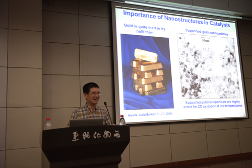 李磊教授的报告题目为“多孔聚合物材料”,李磊教授详细介绍了他的课题组采用嵌段共聚物通过超临界CO2和“Breathing effect”方法制备的多孔聚合物材料,并详述了孔结构、形成机制及其在减反膜中具体应用等方面的最新研究成果。郑南峰教授的报告题目为“纳米表界面化学”,他从博士后阶段进行的用笼子稳定Pd纳米粒子的工作开始,逐步深入地介绍了他及其课题组成员在Pd纳米粒子可控制备,以及含硫化合物、CO等化学物质在纳米粒子界面的粘/脱附行为,并讨论了纳米粒子界面不同粘附行为对其催化活性及稳定性的影响规律。王树涛研究员的报告题目为“可控细胞粘附界面”,通过在硅、PS等基底构筑纳米结构,王树涛研究员的课题组实现了癌细胞的高效捕获,捕获效果几近100%,为癌症的体外检测、药物试验等提供了较先进的技术,而且在对材料软硬、时间等与细胞捕获科学问题进行研究的同时,他们正在逐步推动相关研究成果在临床实践应用方面的快速推进。
