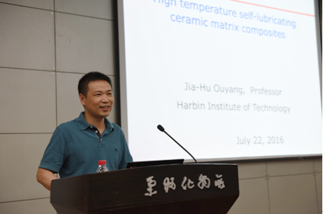 贾德昌教授主要从事新型陶瓷材料、陶瓷基复合材料和陶瓷/金属复合材料的优化设计、断裂损伤机制等方面的基础及应用研究。报告中,贾德昌教授首先介绍了先进结构陶瓷在高科技领域的应用需求,并深入分析了结构陶瓷材料的优缺点。随后,贾德昌教授根据多年从事的先进陶瓷与陶瓷基复合材料及其在航天防热部件上的应用等方面的科研经历及典型案例,与参会师生分享了他对科学研究与工程应用开发工作的感悟与思考。欧阳家虎教授主要从事先进陶瓷与高温陶瓷涂层及可靠性等方面的研究工作,在高温自润滑陶瓷材料方面取得了一系列研究进展。报告中,欧阳家虎教授介绍了其团队关于碱土金属硫酸盐纳米粉体的合成与表征方面的研究工作,并深入分析了复合纳米碱土金属硫酸盐的氧化铝和TZ3Y20A陶瓷复合材料的减摩抗磨机理、热稳定性及其在高温热循环条件下的摩擦学行为。王玉金教授主要从事新型难熔金属基复合材料、超高温陶瓷复合材料的低温制备技术等方面的研究工作。报告中,王玉金教授介绍了超高温陶瓷材料在高科技领域特别是在极端环境下的应用要求,介绍了其研究团队通过引入碳空位、难熔金属和固溶相等方法来制备高强韧碳化锆基超高温陶瓷的研究进展,并就其发明的碳化锆复合材料的低温反应浸渗制备方法作了详细阐述。