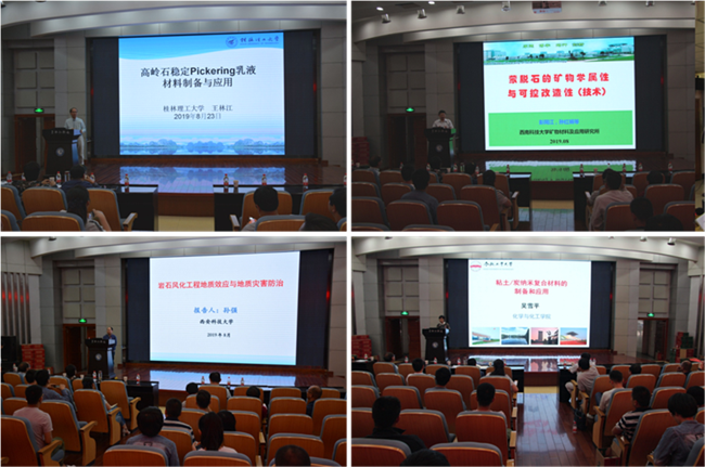 王林江教授从传统乳液和Pickering乳液的稳定出发,系统介绍了其团队在高岭石稳定Pickering乳液材料的制备、卵磷脂改性高岭石稳定乳液对姜黄素和儿茶素的协同包封作用、高岭石的修饰作用效果和乳液稳定机理等方面的工作。彭同江教授从蒙脱石的成分和结构属性出发,介绍了蒙脱石的阳离子交换性和插层处理方法、聚苯胺/蒙脱石纳米复合导电材料、TiO2/蒙脱石纳米复合材料光催化材料以及蒙脱石转变为沸石、方钠石的机制。孙强教授从石窟文物、地质、地貌中岩石风化的工程效应出发,介绍了砂岩、砂质泥岩原位崩解与水的关系,石窟本体中的长石、钙质胶结物的风化过程,石窟内凝结水的过程及其对石雕文物风化作用等。吴雪平副教授系统介绍了粘土/炭材料的制备和活化策略、SCR催化剂载体用粘土/炭的制备和性能评价以及粘土/炭材料在碳纤维复合材料制备中的应用。