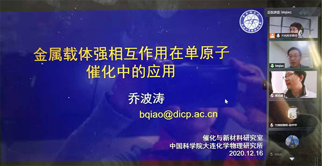 12月16日,应羰基合成与选择氧化国家重点实验室邀请,中国科学院大连化学物理研究所乔波涛研究员与中国科学院兰州化学物理研究所进行线上学术交流,并作了题为“金属载体强相互作用在单原子催化中的应用”的学术报告。