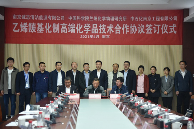 4月23日,中国科学院兰州化学物理研究所、南京诚志清洁能源有限公司、中石化南京工程有限公司就“乙烯羰基化路线制甲基丙烯酸甲酯(MMA)技术开发”项目达成合作,并举行签约仪式。兰州化物所副所长赵培庆、南京诚志总经理唐卫兵、中石化南京工程党委副书记、总经理吴吉波分别代表三方签订合作协议。三方相关人员参加了签约仪式。