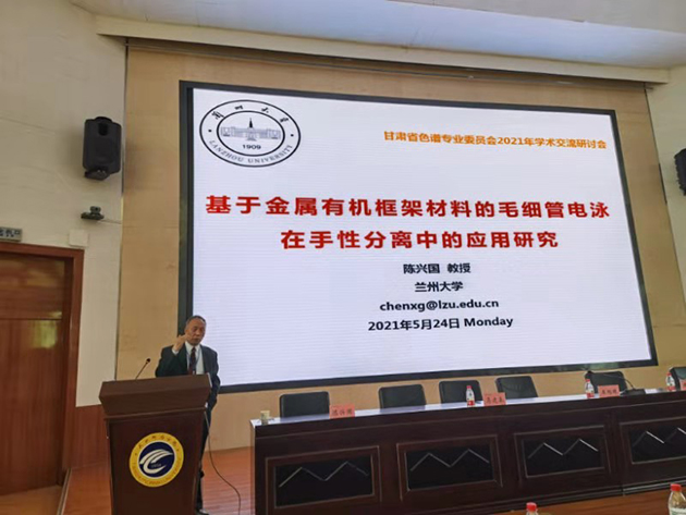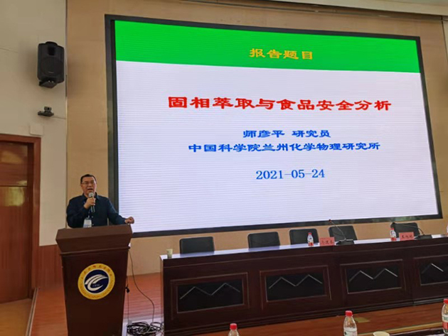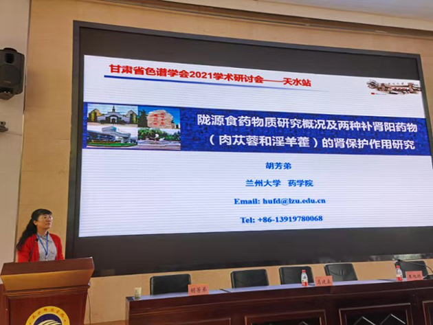 甘肃省化学会色谱专业委员会秘书长邱洪灯研究员主持会议学术报告。师彦平研究员,兰州大学陈兴国教授,甘肃省医学科学研究院药物研究所所长、国家中医药管理局三级中药分析实验室主任石晓峰、兰州大学胡芳弟教授分别作了题为“固相萃取与食品安全分析”“基于金属有机框架材料的毛细管电泳在手性分离中的应用研究”“药用植物高值化利用的思考与实践”“陇源食药物质产业概况及两种补肾阳中药的肾保护作用研究”的大会报告。浙江福立仪器工程师雷晓强作了题为“福立仪器的发展之路及行业整体调整解决方案”的报告。