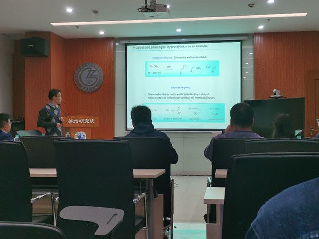 报告中,孙建伟教授重点介绍了其课题组在炔烃区域和立体选择性氢官能团化的工作。他们利用配体和底物调控实现了硅基炔烃的区域与立体选择性硅氢化和硼氢化反应、反式氢化反应,巯基炔烃的区域和立体选择性硼氢化以及双硼氢化反应,通过理论和实验系统研究了反应的机理。相关工作发表于J. Am. Chem. Soc.、Angew. Chem. Int. Ed.、Nat. Commun.等期刊上。