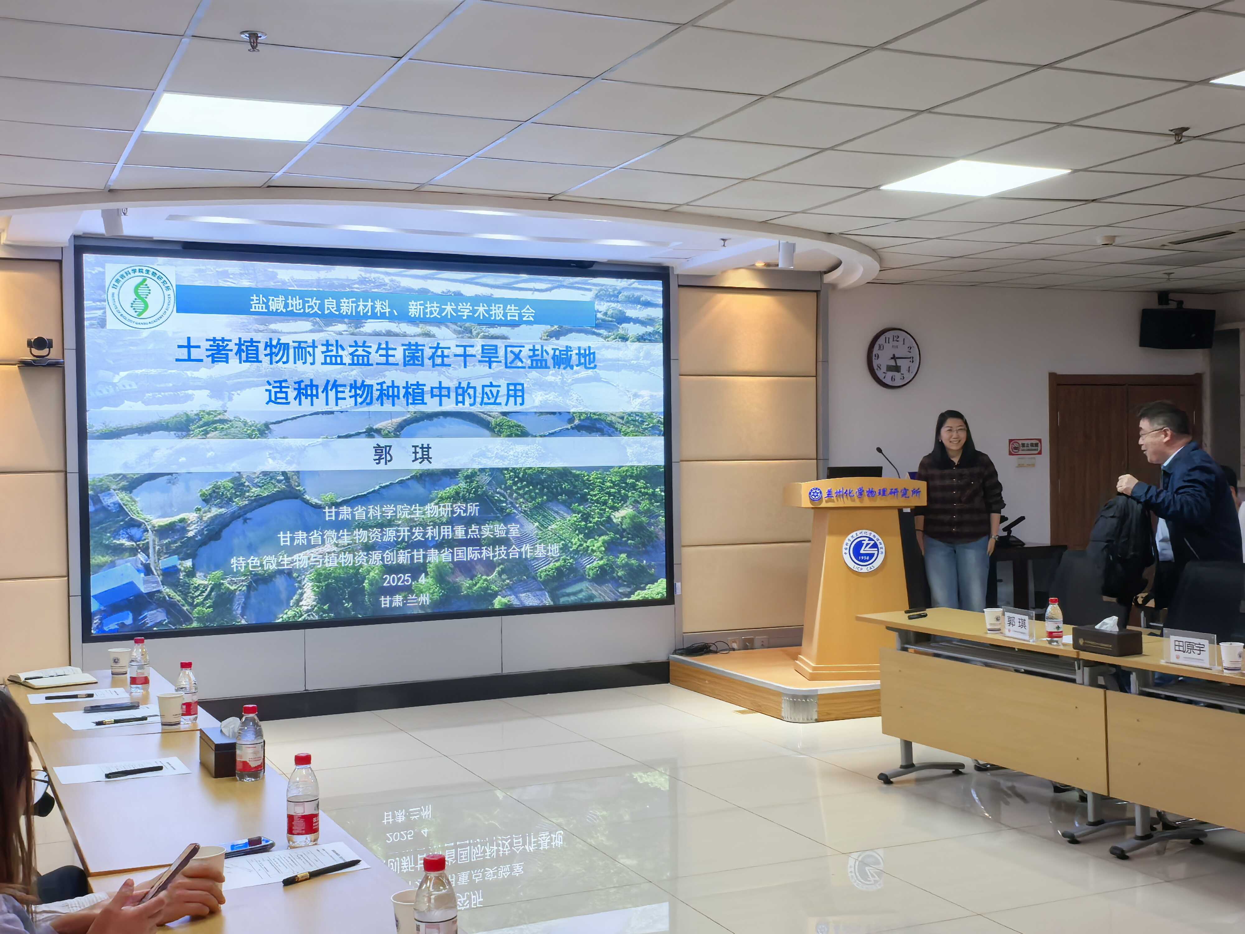 郭琪作了题为“耐盐益生菌资源开发与盐碱地适生作物培育”的报告,介绍了其团队立足甘肃盐碱地分布特征,采用“微生物-植物-土壤”协同修复策略,构建的耐盐碱复合菌剂技术体系,实现了甜高粱、玉米等适生作物种植增产提质的实践结果。