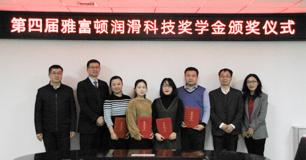 近日,中国科学院兰州化学物理研究所第四届雅富顿润滑科技奖学金颁奖仪式在青岛研发中心举行。雅富顿添加剂公司亚太区技术总监梁克坚先生、战略技术经理王银辉女士、兰州化物所相关部门负责人参加了颁奖仪式。张嘉莹、董瑞、巴召文、强睿斌等4名学生获得2020年度奖学金。