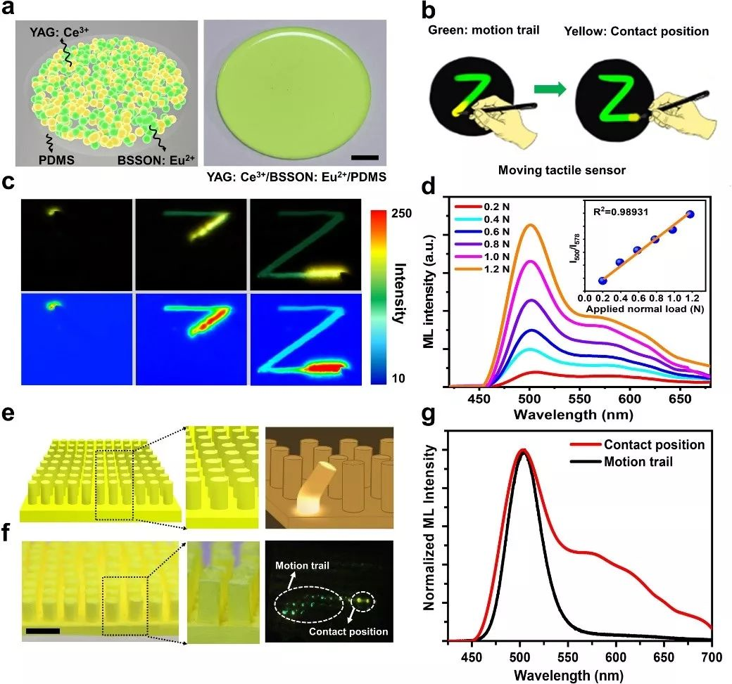 另一种器件是全方面的移动触觉传感器。随着智能化的到来,人工智能技术已成为科技发展的大势所趋,其中智能传感至关重要。科研人员通过同时利用YAG:Ce3+和BSSON:Eu2+这两种摩擦发光材料各自的秉性,构筑了一种非常神奇的触觉传感器(如图3)。