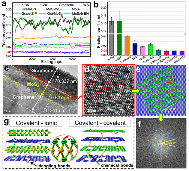 研究发现,当共价/离子型异质二维叠层复合时,展现出协同润滑效应。共价型化合物(如石墨烯)以共用电子对的方式成键,具有定向性和饱和性,在滑动过程中相邻层面缺陷位置的悬键会发生强烈的化学作用。而离子型化合物(如二硫化钼)靠正负离子间的吸引作用,不具有定向性和饱和性,即使发生局部缺陷离子的丢失,周围的离子也会进行补充屏蔽,弱化其与外部的相互作用。共价/离子叠层复合设计可以有效阻隔共价化合物相邻层间的强化学相互作用,削弱宏观摩擦过程中缺陷、棱边键等的不利作用。异质晶格匹配在宏观摩擦过程中同样展现出天然非公度性,可以不依赖于滑移角度实现超润滑状态。该理论认识可以解释传统石墨与二硫化钼复合材料的协同润滑作用机制。