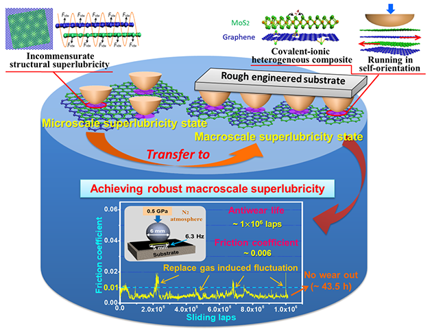 “超润滑”是近代摩擦学研究的重要科学发现,源于1990年左右提出的“结构超润滑”理论预测:当两个理想、平坦的刚性晶面以非公度接触方式发生相对运动时,上下表面间的原子势作用相互抵消,滑移势垒为零,出现摩擦力消失或接近为零的现象。“结构超润滑”理论的工程实现将有望为节能降耗、机械装备设计带来革命性的进步。通过多年研究,目前可以在一些理想的层状晶体材料(如高定向石墨)表面实现纳米以及微米接触尺度的“结构超润滑”,但在宏观工程接触尺度,材料表面存在无序、吸附和缺陷等,如何实现宏观接触尺度的超润滑已成为研究的焦点和工程化应用的瓶颈。