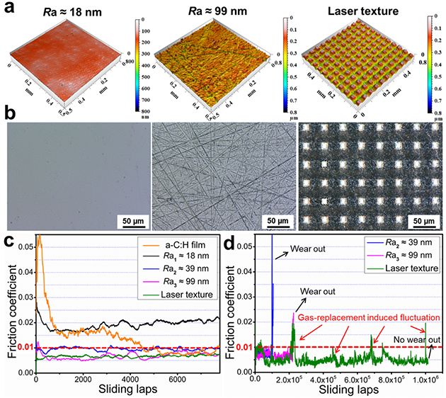 研究工作基于两个核心设计思想:基于微纳接触尺度更易满足结构超润滑的理想获得条件的考虑,在工程粗糙的基材表面通过激光刻蚀等表面处理技术主动构筑微纳凹凸体,将宏观的面接触分解为无数的微纳点接触;在表面设计制备特殊的异质二维纳米结构润滑层,通过对层-层接触滑移方式、层间弱的化学相互作用和非公度的晶格匹配的控制,在每个接触点上获得超润滑态,大量接触点组合形成了整个接触面上的宏观超润滑。利用球-盘摩擦试验机进行评价,在0.5 GPa的接触应力下,工程粗糙的钢-钢接触摩擦副间获得了稳定、长效的超润滑性能(摩擦系数0.007,寿命大于1×106转)。进一步通过复合粘结剂,制备粘结润滑涂层,在高接触应力(1.3 GPa)下仍保持超润滑特性,展现出优异的工程实用价值。