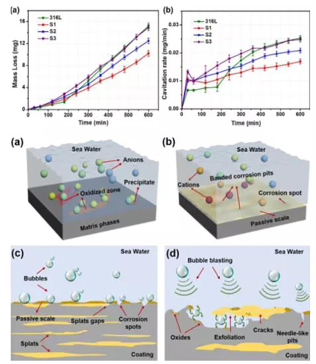 中国科学院兰州化学物理研究所磨损与表面工程课题组长年从事热喷涂涂层材料的耐气蚀性能研究。通过多年的研究积累,该团队针对WC基超硬涂层、铁基非晶涂层、Ni基金属涂层、氧化物陶瓷涂层等开展了在去离子水和人工海水的耐气蚀性能研究。