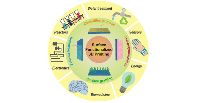 3D打印(亦称增材制造)技术因其独特的材料成型优势,在生物医药、航空航天、汽车制造以及电子工业等众多领域显示出巨大的应用潜力。但是,不同的应用领域要求3D打印器件不仅具有个性化的结构设计,而且要展现出优异的功能特性。3D打印与传统表面工程技术相结合,即表面功能化3D打印(Surface functionalized 3D printing,图1),能赋予3D打印材料与器件新的功能特性,包括润湿性、生物兼容性、导电性等,从而拓展其在生物医药、结构工程、柔性电子等领域实现功能器件的制造。