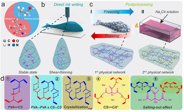 王晓龙对DeepTech说,此次实现双网络水凝胶的3D打印有三个关键步骤。首先,在原材料选取上,将聚乙烯醇(PVA)和壳聚糖(CS) 按照一定比例配制,形成具有优异流变学性能——即剪切变稀性和触变性的墨水材料,然后将适合直书写的墨水通过3D打印形成三维结构体,也就是水凝胶前驱体;第二个关键步骤是将上述打印形成的三维结构体进行冷冻 - 解冻循环处理,形成双网络水凝胶的第一层网络——具有较高强度的PVA物理结晶网络,该层网络将提供稳定的形状支撑作用;最后,将冷冻 - 解冻之后的结构体放入盐溶液中浸泡,让壳聚糖与盐溶液中的金属离子进行配位交联,形成双网络水凝胶的第二层网络——离子配位网络。