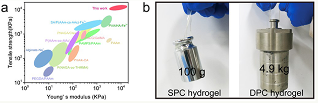 图 | 3D 打印双物理交联网络水凝胶与 SPC 水凝胶力学性能与展示