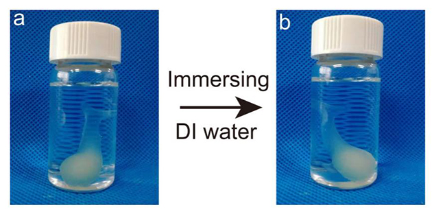 图 | 3D 打印 DPC 水凝胶在去离子水中浸泡 30 天前(a)后(b)