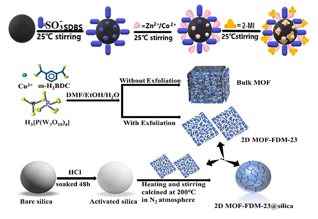 图1.3D MOF@silica and 2D MOF@silica复合材料制备示意图